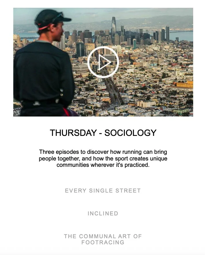 During the Covid-19 Pandemic, as parents and teachers struggled to work from home while also home-schooling/entertaining their children during lockdowns, this email from Salomon was intended to offer a respite. It was a weeklong schedule of previously released Salomon TV episodes built around school subject matters such as Science, Geology and Sociology. For Salomon, it provided a reason to reach out to consumers during a time when creating new outdoor content was challenging.