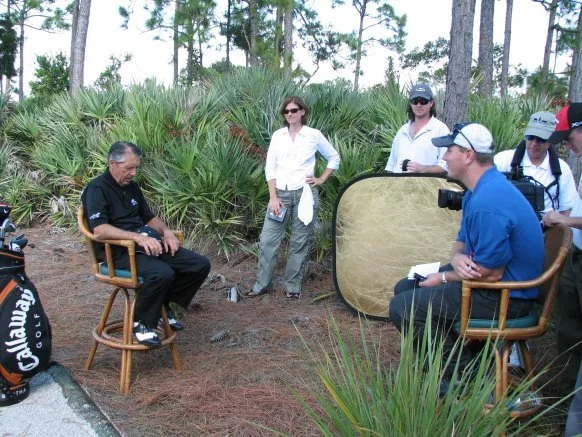 From golf to ski to Olympic athletics, significant experience as an executive producer on brand commercial shoots, product discovery sessions, and press events. This includes creative concepts, scriptwriting, and conducting on- and off-camera interviews with legends from the sporting world such as Arnold Palmer, Phil Mickelson, Ernie Els, and Gary Player (who is not sleeping during my interview of him, contrary to what it may seem in the photo below).